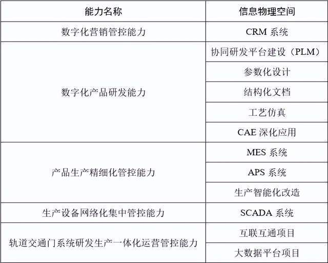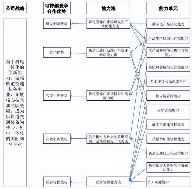从企业发展战略、战略举措、推进企业数字化转型和可持续竞争合作优势需求出发,识别业务场景、价值模式,策划了轨道交通门系统研发生产一体化等5个新型能力流和12个新型能力单元: