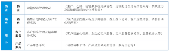 生产能力要素还包括物流、销售、客户服务、产品服务4个能力子域。其成熟度可以从运输配送管理状况、销售计划指定及客户管理现状、客户信息管理及精准服务状况、产品服务系统等指标来考察。