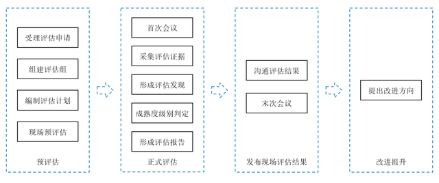 智能制造能力成熟度评估流程包括预评估、正式评估、发布现场评估和改进提升四个步骤。