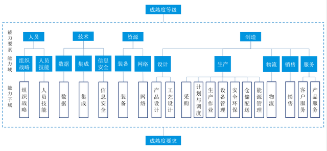 智能制造能力成熟度模型给出了4个能力要素,包括人员、技术、资源和制造。并基于这4个能力要素进行分解,形成能力域及能力子域。