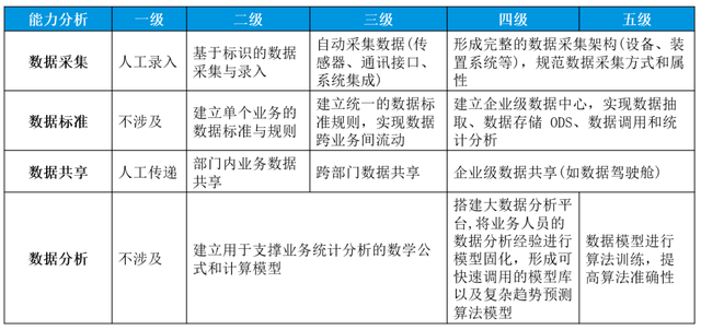 智能制造能力成熟度标准中数据成熟度能力的描述可以从四个关键活动特征来评判,即数据采集、数据标准、数据共享、数据分析,涵盖了从数据采集到使用的整个过程。