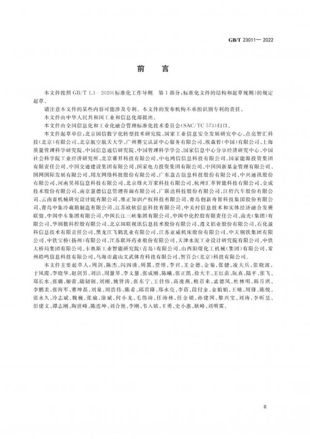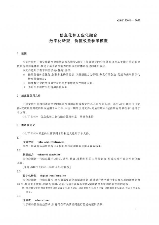 近日,国家市场监督管理总局(国家标准化管理委员会)发布2022年第13号中国国家标准公告,批准《信息化和工业化融合 数字化转型 价值效益参考模型》(GB/T 23011-2022,简称《数字化转型 价值效益参考模型》)、《信息化和工业化融合管理体系 供应链数字化管理指南》(GB/T 23050-2022,简称《供应链数字化管理指南》)、《信息化和工业化融合管理体系 生产设备运行管理规范》(GB/T 23022-2022,简称《生产设备运行管理规范》)和《信息化和工业化融合管理体系 生产设备运行绩效评价指标集》(GB/T 23023-2022,简称《生产设备运行绩效评价指标集》)4项国家标准正式发布,这是立足新发展阶段,深入推进两化深度融合、加速数字化转型的最新成果,对加快新型工业化发展具有重要意义。