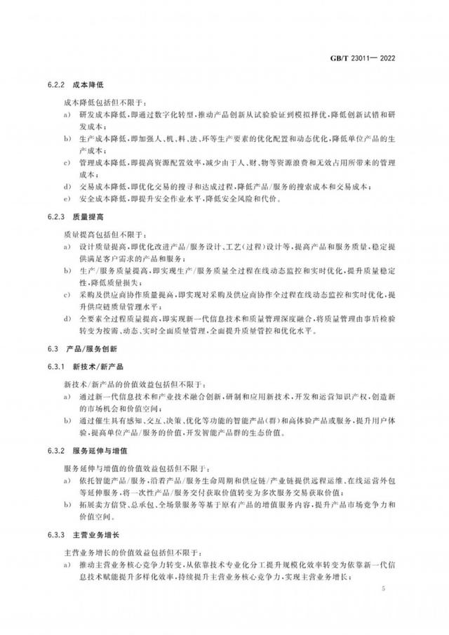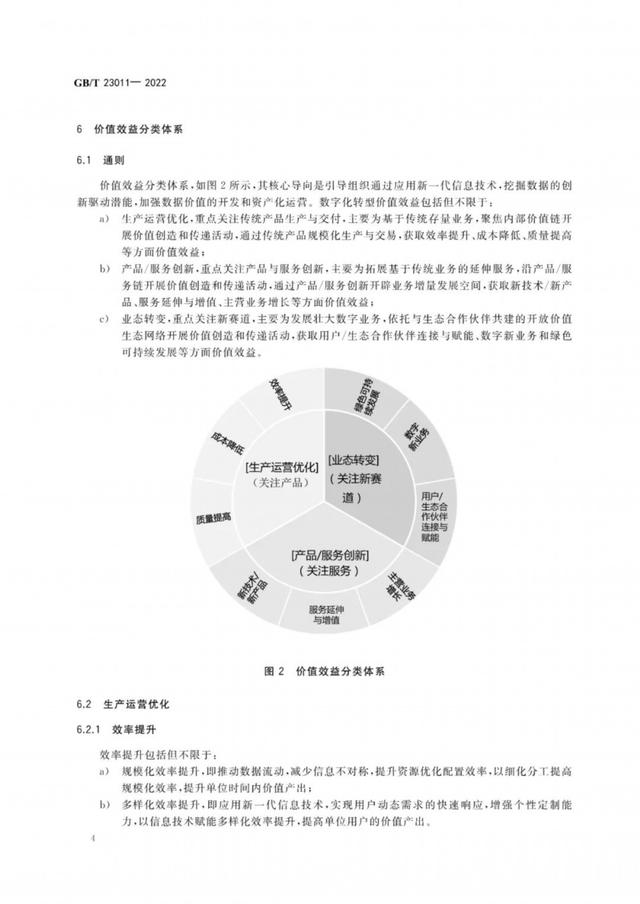 价值效益分类体系给出数字化转型可实现的价值效益参考分类,从生产运营优化、产品/服务创新、业态转变等方面,明确数字化转型过程中不断跃升的价值效益。